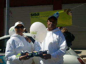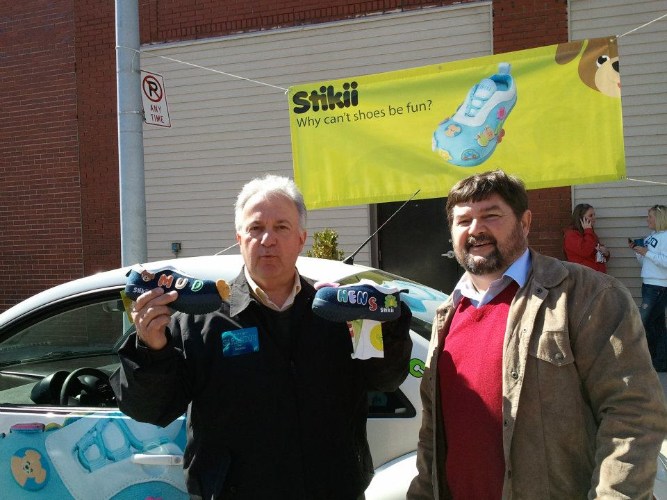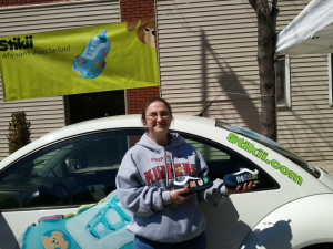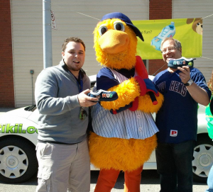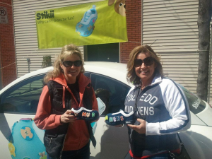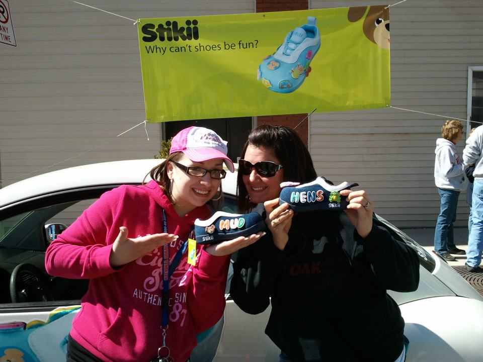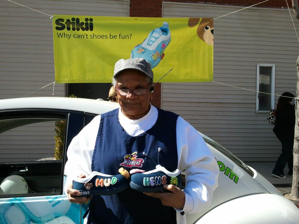 We set up a banner alongside the road, where we invited anyone and everyone to stop and check us out. We also brought along a selection of Stikiis, which we personalized with our new alphabet Stik-ems! One pair was custom made for Muddy, the Mud Hen’s mascot, and read “Mud Hens” across the the outside of the shoes. Check out all of these great shots from the opening day festivities!
